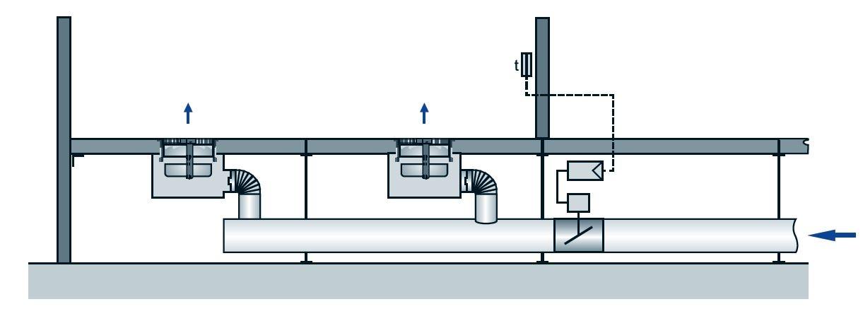 The use of plenum boxes is recommended for individual room temperature control. This gurantees that air flow rate to each room can be controlled separately, e.g by room thermostats.