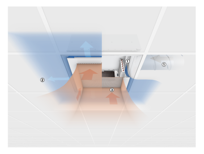 Primary and secondary air mix and are then supplied to the room horizontally through the supply air slots.